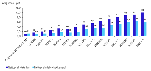 Nettoprisindekset anvendes ofte som grundlag for prisregulering ifm. indgåelse af forskellige kontrakter, herunder aftaler om huslejer. Nettoprisindekset opgøres også eksklusiv energi. Figur 1 herunder viser udviklingen i nettoprisindekset i alt og eksklusiv energi. I de sidste 10 år op til juli 2021 voksede nettopriserne i alt med 1,0 pct. p.a. og nettopriserne ekskl. energi med 1,1 pct. p.a. Siden er prisudviklingen imidlertid vokset kraftigt. I september 2022 nåede nettoprisindekset i alt op på 10,0 pct. set ift. samme måned året før. Nettoprisindekset ekskl. energi er imidlertid vokset noget langsommere. I september 2022 voksede det med 6,1 pct. eller 3,9 pct. mindre end det samlede nettoprisindeks.