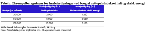 Forskellen i prisudviklingen for nettoprisindekset i alt og ekskl. energi kan illustreres med eksemplet i tabel 1 herunder. Har man fx en aftale om husleje på 50.000 kr. om måneden, som reguleres med nettoprisindekset, og anvender vi de seneste september tal for de årlige vækstrater, vil den månedlige husleje være steget med 10,0 pct. eller 5.000 kr. Såfremt der i stedet var blevet prisreguleret med nettoprisindekset eksklusiv energi, ville huslejestigningen have været 6,1 pct. eller 3.050 kr. Forskellen i huslejestigningen vil i eksemplet være på 1.950 kr. pr. måned.