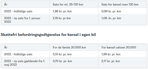Herudover gælder det nu, at virksomheder kan godtgøre udgifter til erhvervsmæssig befordring med op til 3,70 kr. pr. km, hvilket er en stigning på 19 øre. Ændringen trådte i kraft 1. maj 2022.
